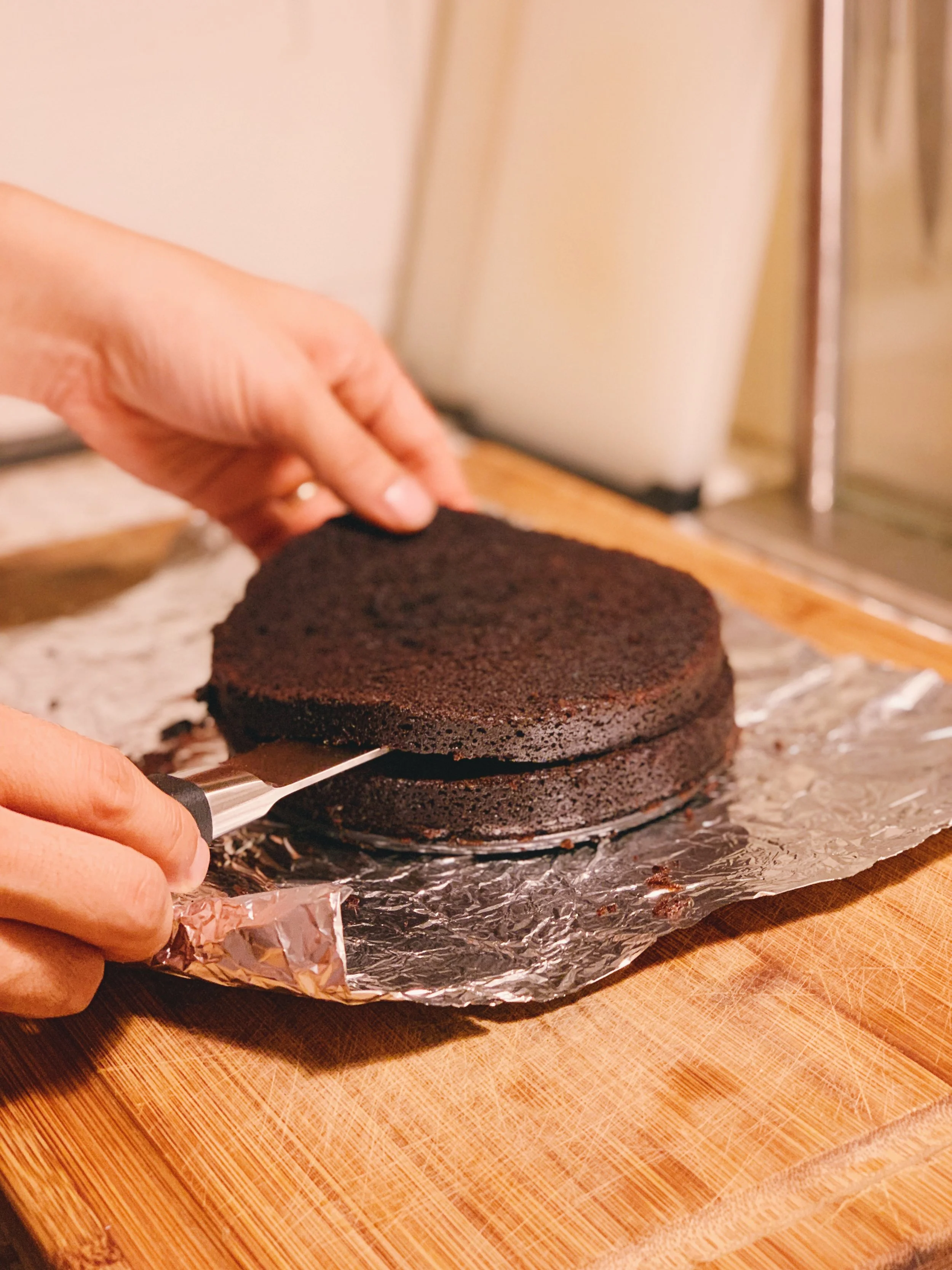 A good friend of mine, Sasha, taught me how to make my first cake some years ago. I ended up loving this chocolate stout cake paired with this frosting recipe. The recipe conveniently uses one bottle of stout and is simple to follow. I used a mini 6” springform pan and my husband helped slice the layers after the cake had cooled sufficiently.