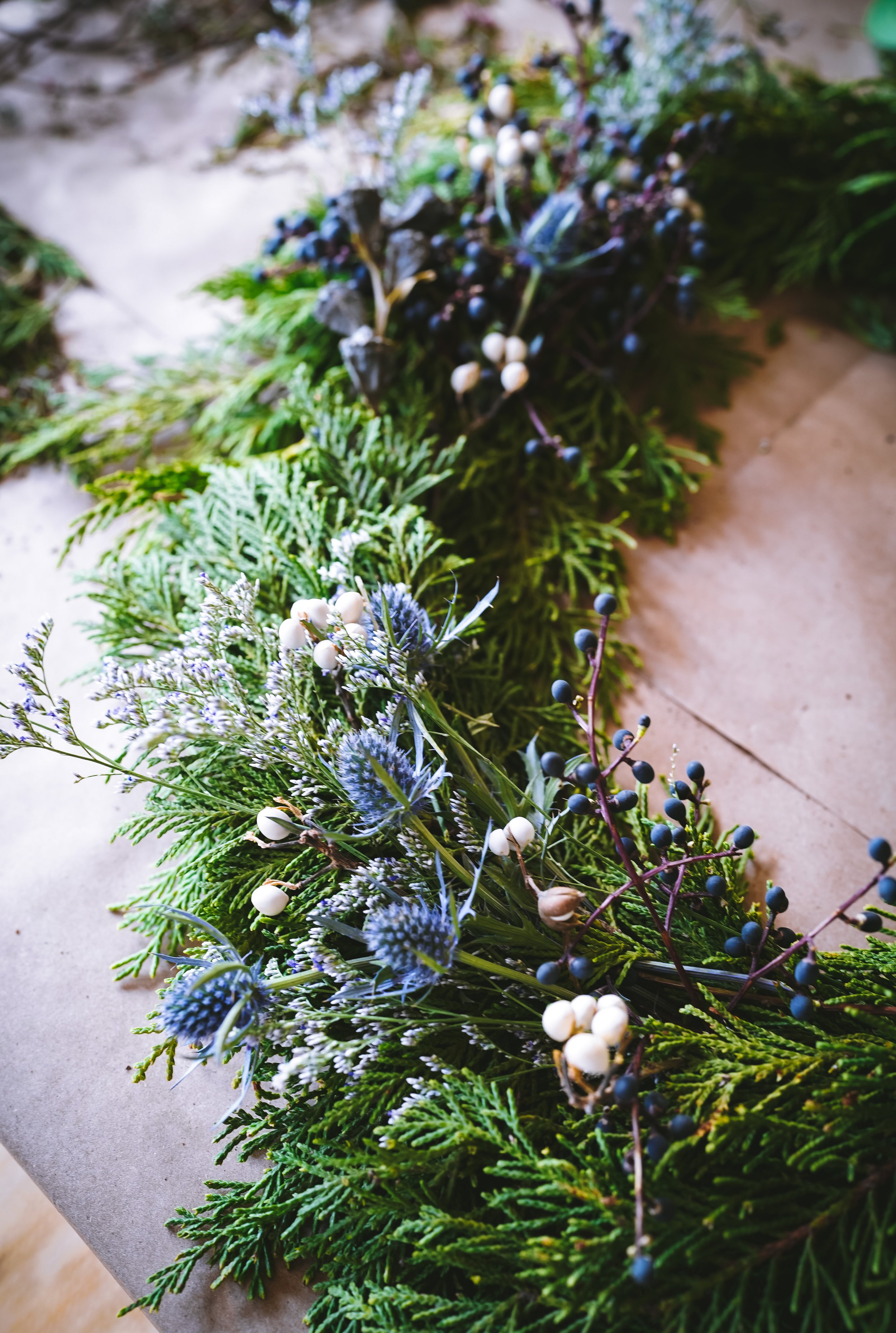 To celebrate the beginning of December and the upcoming holidays, we hosted a little get together with our friends, Alan, Eileen, and their son in our home. We made some wreaths in the kitchen with greenery and flowers we picked up from the local flower market. The scents of fresh pine, spruce, and cedar wafted throughout the room along with warm spices from mulled, wassail wine on the stove.